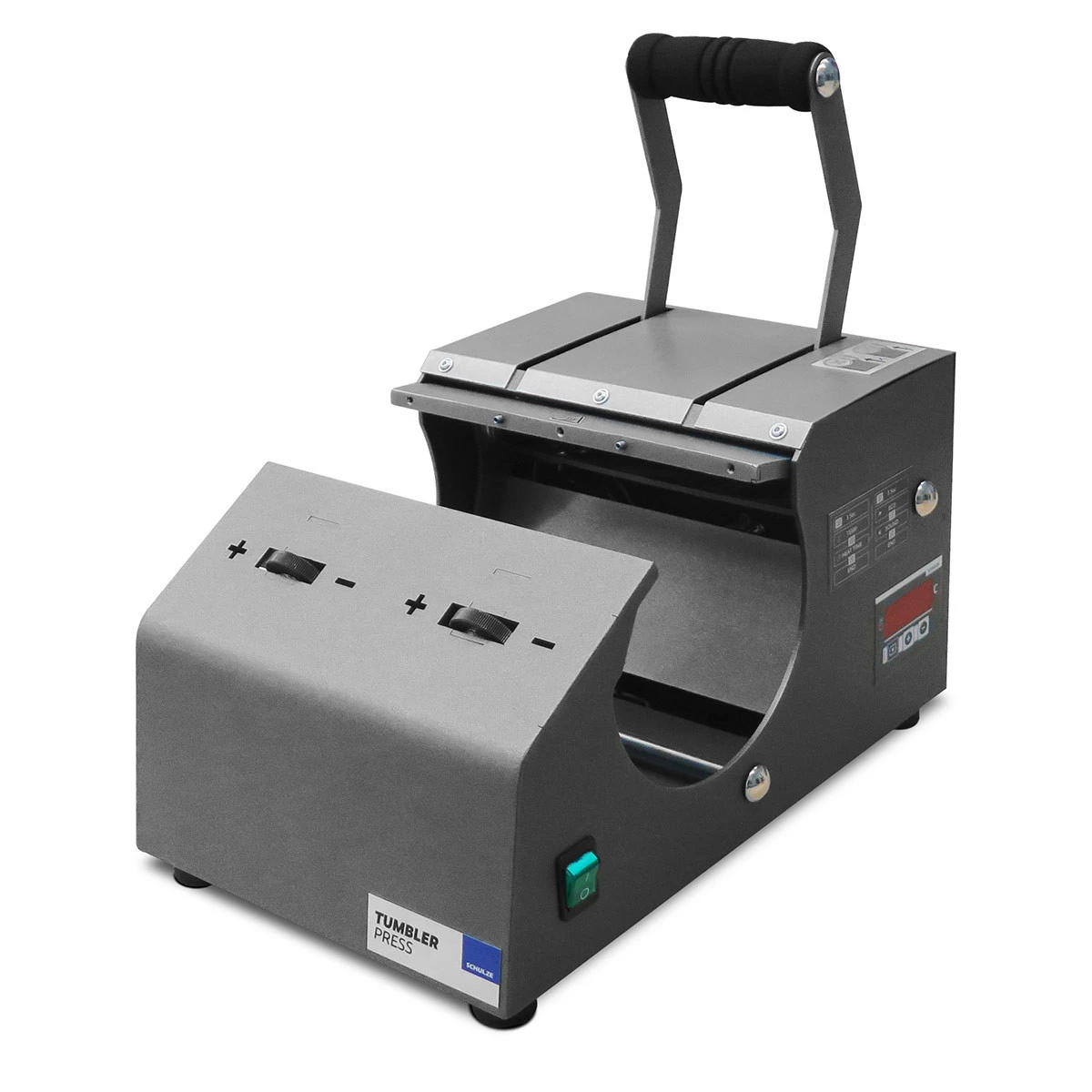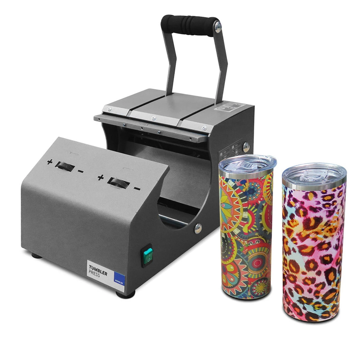 Die Schulze Tumbler Press ist die erste Transferpresse für Becher und Trinkflaschen in Profiqualität mit unterschiedlichsten Durchmessern. Jetzt kannst du für deine Kunden perfekt veredelte Becher und Trinkflaschen sicher und effizient produzieren. Die Tumbler Press verkaufen wir als Set mit Basisgerät und 74 mm Heizmanschette.