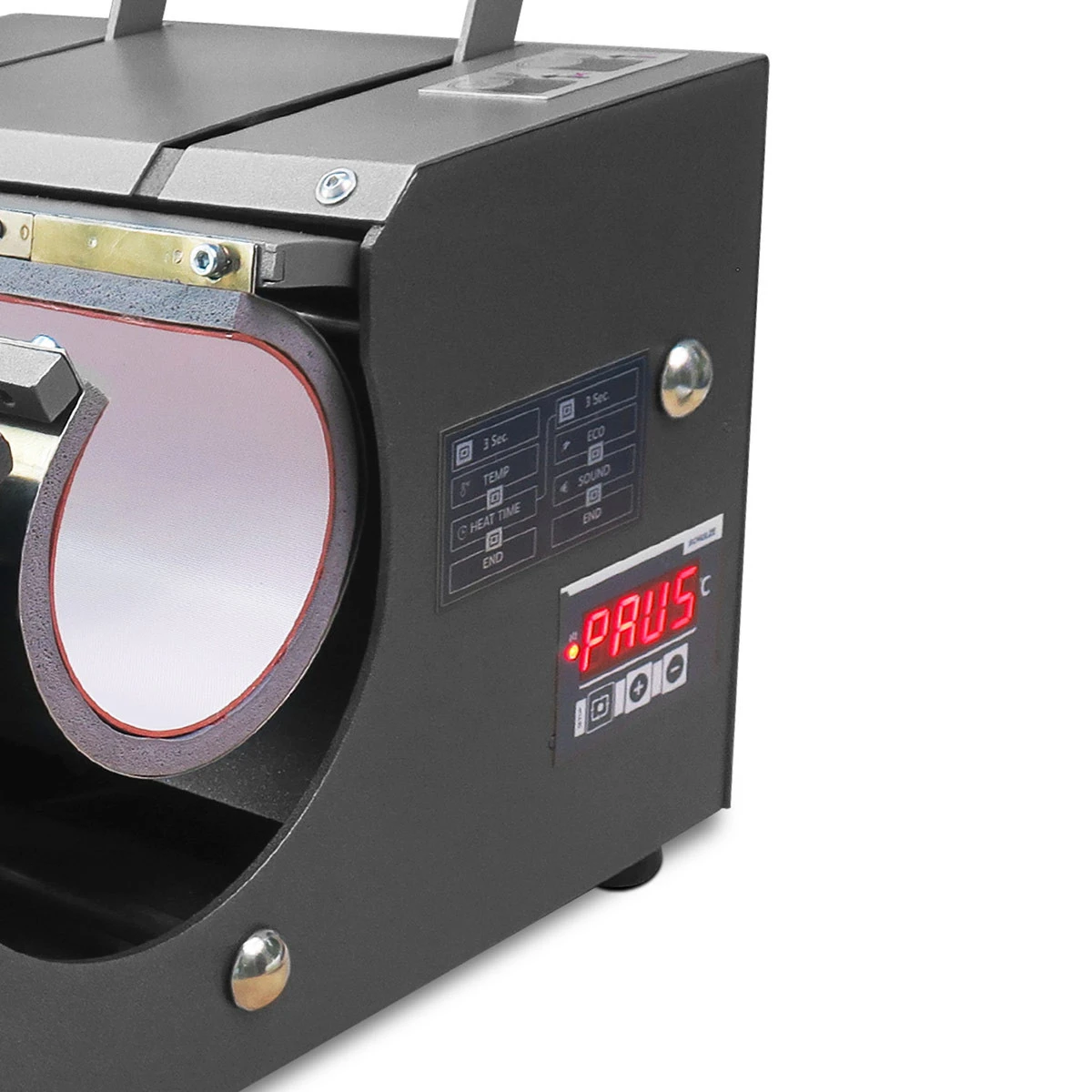 Sobald die Thermopresse auf die eingestellte Temperatur aufgeheizt ist, das zu bedruckende Objekt eingelegt und der Hebel geschlossen ist, startet der Pressvorgang automatisch. Gleichzeitig beginnt der Timer an zu laufen, damit du immer im Blick hast, wie lange der Pressvorgang noch dauert. Es ist auch möglich, den Pressvorgang zu pausieren, um zum Beispiel das Gefäß zu drehen.Dies ist bei gewünschter Vollfläche unbedingt nötig.