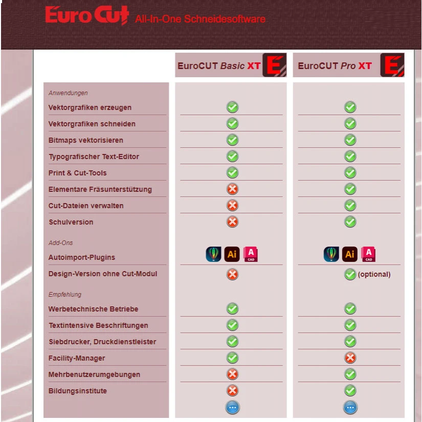 EuroCut wird in 2 Ausführungen angeboten. EuroCut Basic XT ist eine Beschriftungssoftware für die täglichen Arbeiten in einem werbetechnischen Kleinbetrieb. EuroCut Professional XT ist das professionelle Folien-Schneideprogramm für den anspruchsvollen Werbetechniker.