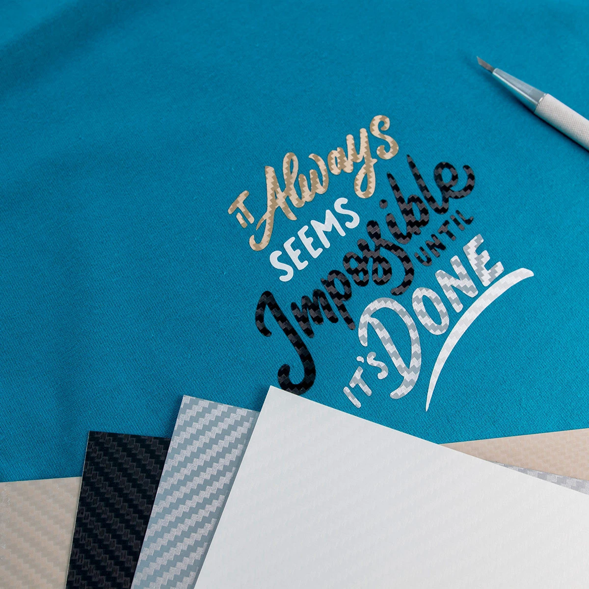 POLI-FLEX® Carbon ist mit allen marktüblichen Plottern zu schneiden. Wir empfehlen die Verwendung eines Standardmessers (45°). Nach dem Entgittern wird die geschnittene Flex-Folie mit einer Transfer- presse übertragen. Bei POLI-FLEX® Carbon ist der Liner warm abzuziehen.