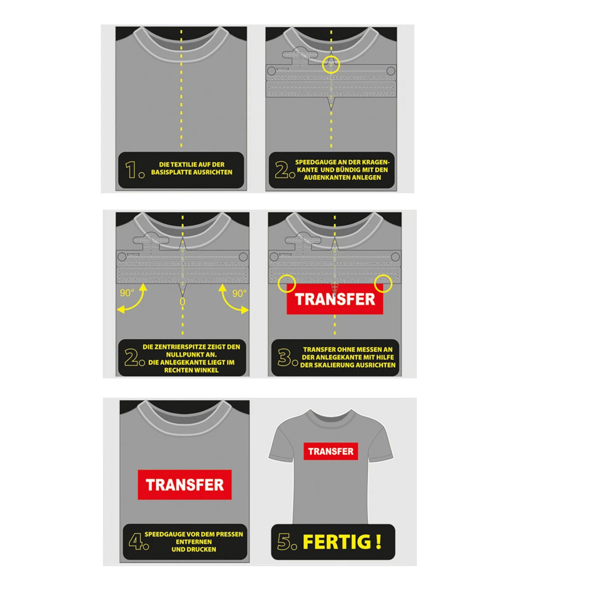 Die optimale Positionierhilfe für den Transferdruck. Fehlpositionierungen waren gestern, mit Speedgauge gelingt Ihnen jeder Print auf Anhieb. Die Verwendung ist kinderleicht und in wenigen Sekunden zu erlernen. Der Speedgauge ist ideal für immer wieder kehrende Arbeitsabläufe oder auch nur den schnellen Print nebenbei. Das lästige Messen entfällt, die Positionierung erfolgt lediglich über die Skalierung. Egal in welcher Auflage, erzielen Sie ein immer gleiches Ergebnis.