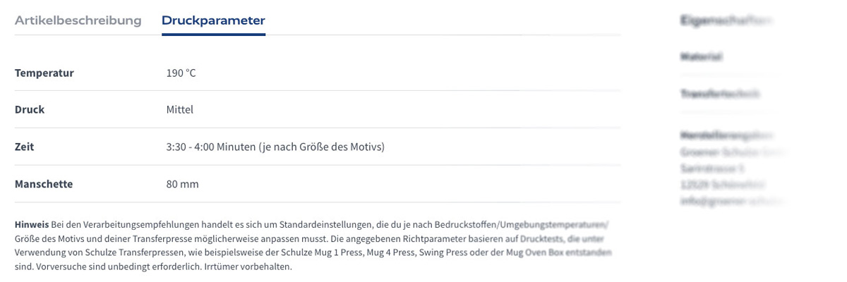 Bei Sublimationsartikeln haben wir die jeweils gültigen Verarbeitungsparamater wie Anpressdruck, Temperatur und Zeit hinterlegt.