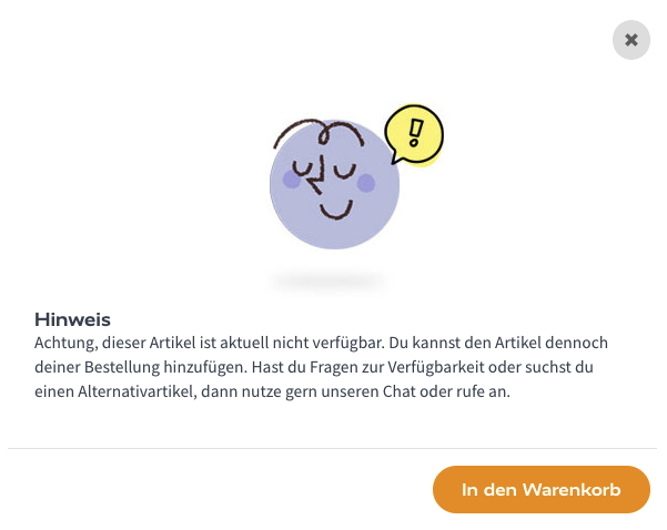 Nicht bei uns verfügbare Artikel, die dennoch in den Warenkorb gelegt werden, führen zukünftig zu einer kurzen Hinweismeldung.