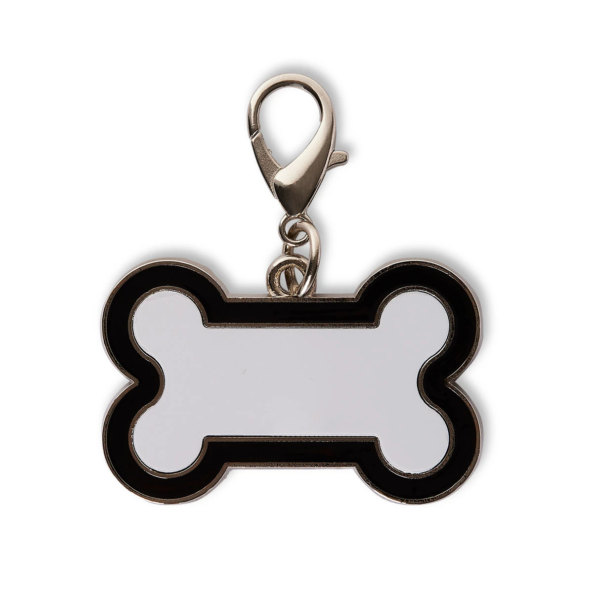 Anhänger in Form eines Hundeknochens aus Metall. Die Anhänger sind in drei verschiedenen Farben verfügbar und das beiliegende Metallplättchen ist bestens für Sublimation geeignet.
