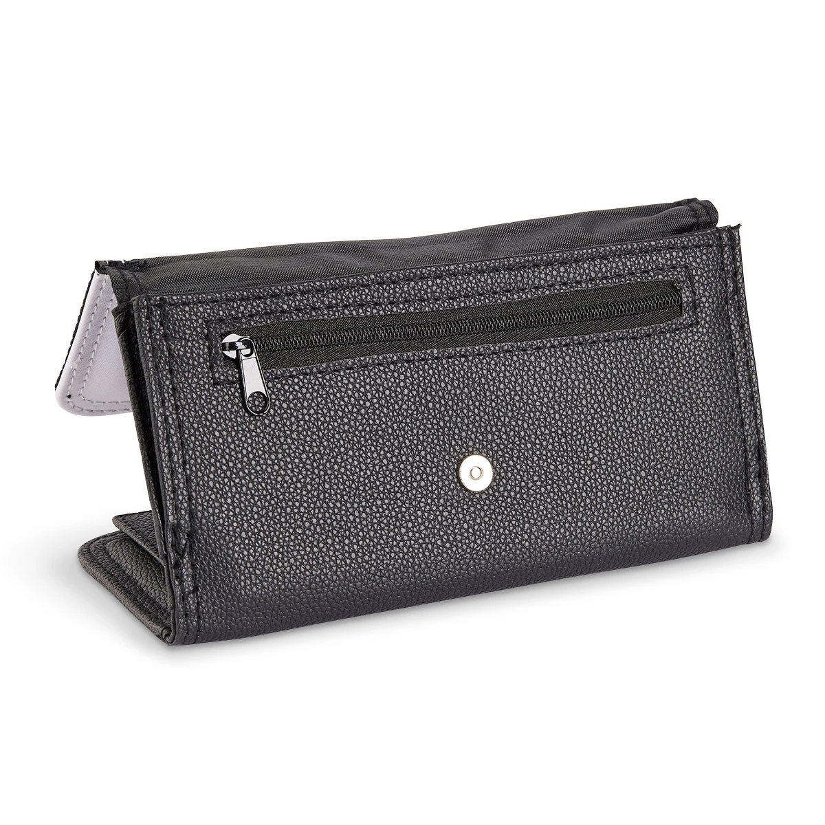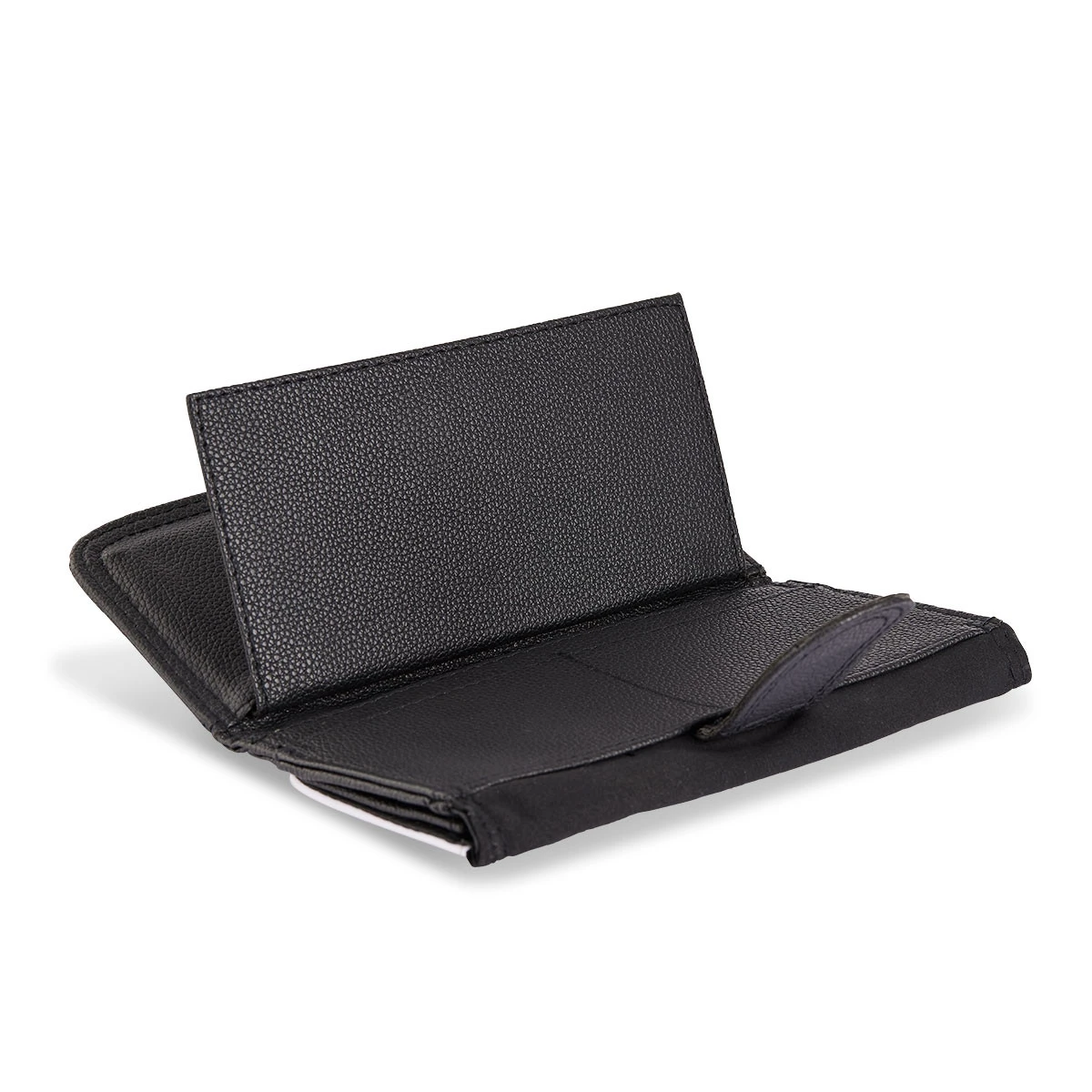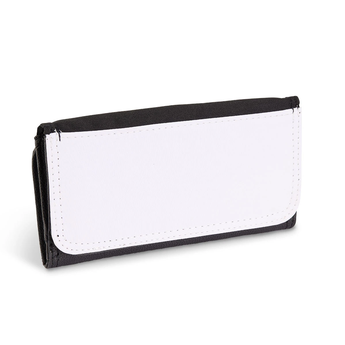 Schwarze Geldbörse aus Kunstleder mit weißem, bedruckbarem Cover. Die Geldbörse ist ausgestattet mit einem Scheinfach, 12 Einsteckfächern, einem separaten, herausnehmbaren Innenteil und einem Fach für Münzen mit Reißverschluss.