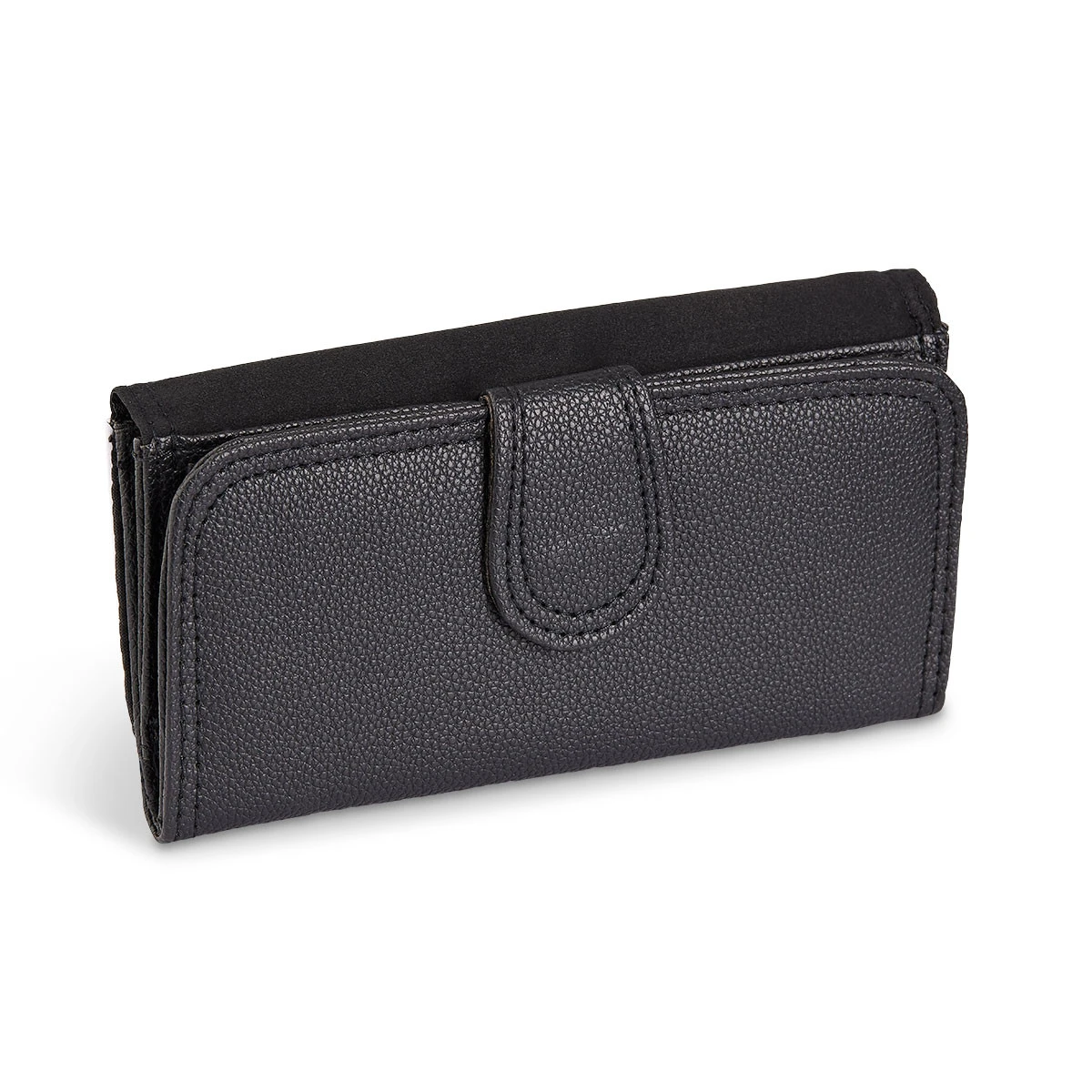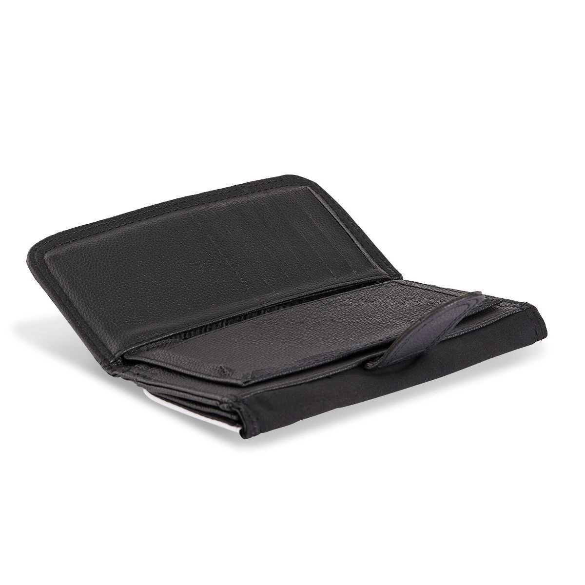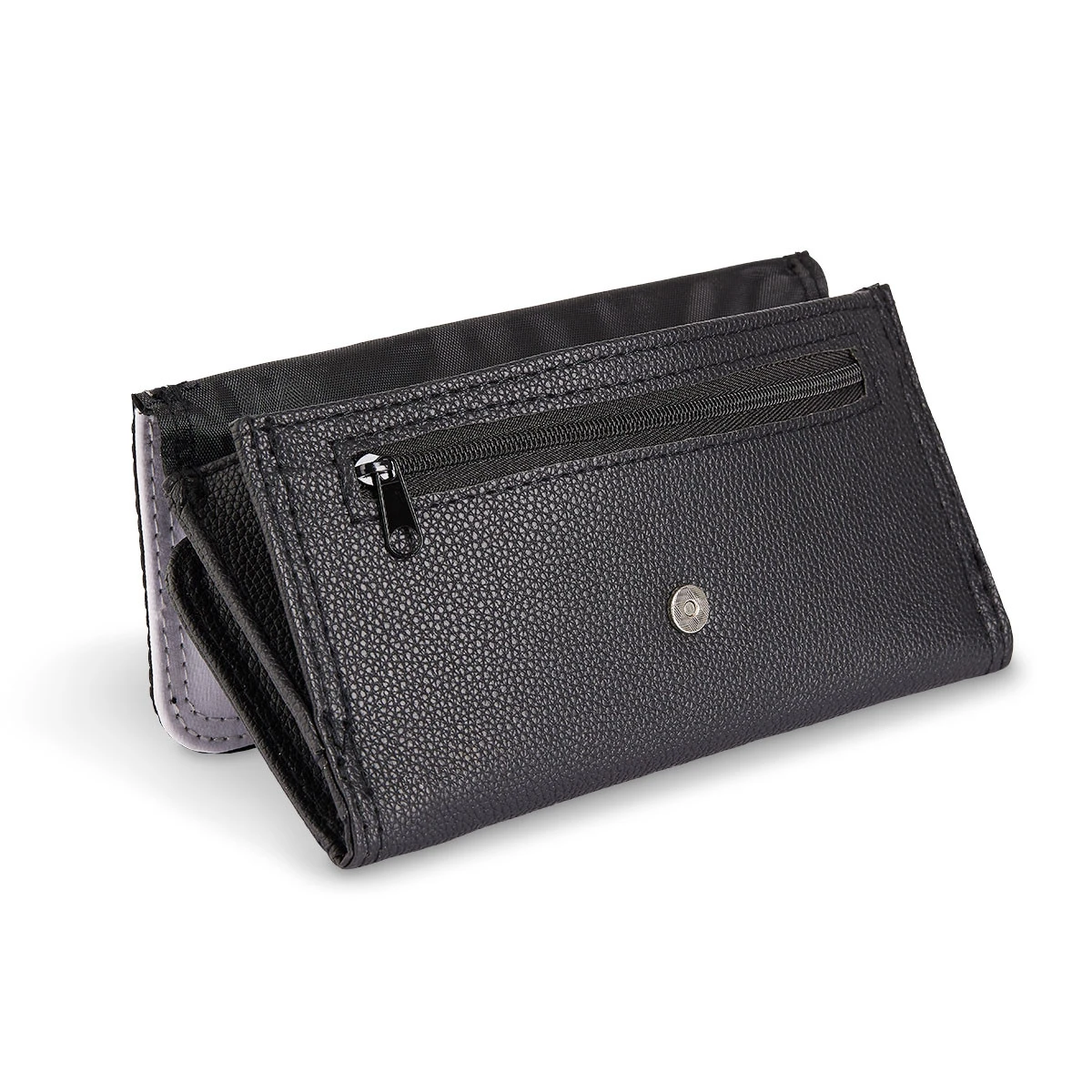 Schwarze Geldbörse aus Kunstleder mit weißem, bedruckbarem Cover. Die Geldbörse ist ausgestattet mit einem Scheinfach, 12 Einsteckfächern, einem separaten, herausnehmbaren Innenteil und einem Fach für Münzen mit Reißverschluss.