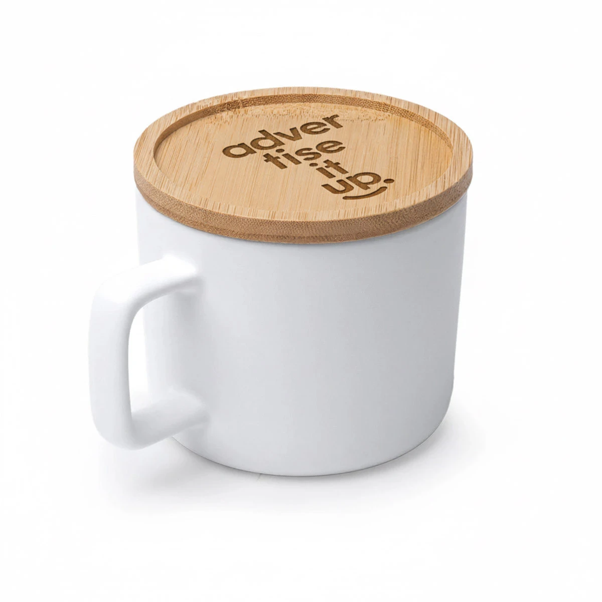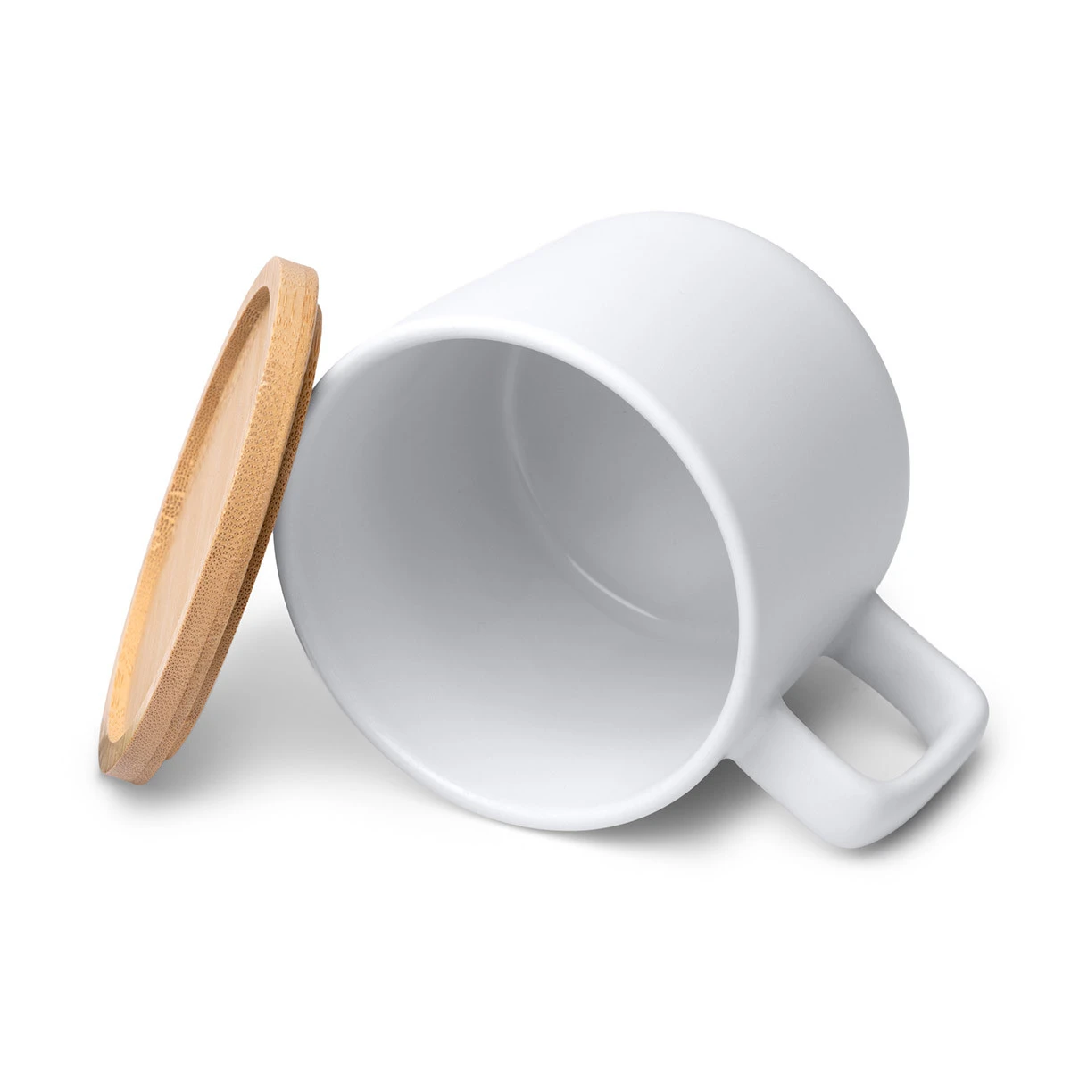Weiß matter Keramikbecher mit Bambusdeckel, der auch als Untersetzer dient. Die Tasse ist für Sublimation geeignet, der Untersetzer lässt sich mittels Laser personalisieren.