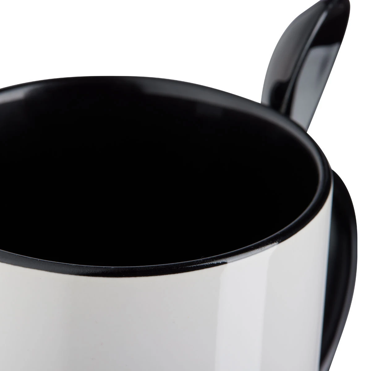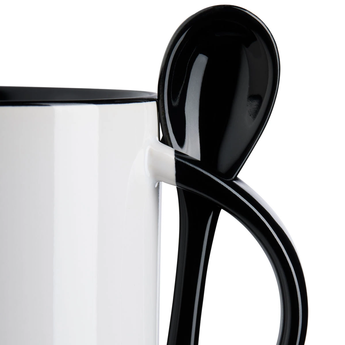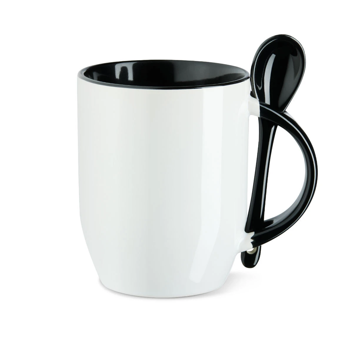 Hochwertige 12 oz Keramiktasse, außen weiß, die Innenseite, der Henkel und der Keramiklöffel gleichfarbig. Die Tasse ist in 7 Farben lieferbar, aufgrund der Orca-Beschichtung bestens zu sublimieren und 100 % spülmaschinenfest.
