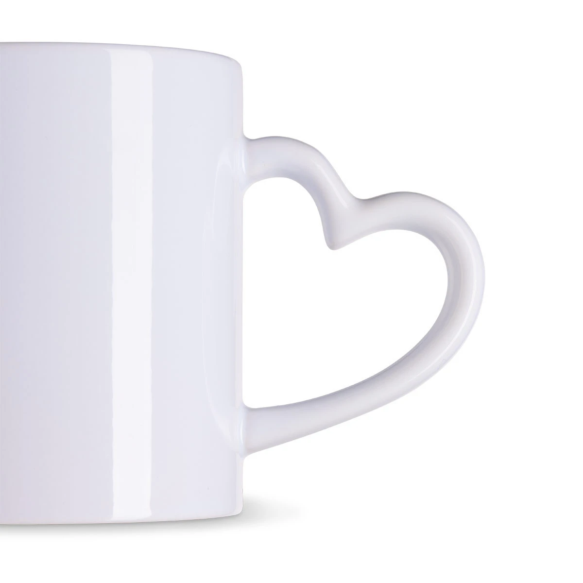 Weiß glänzende, 11 oz Keramiktasse mit Herzhenkel. Bestens für Sublimation geeignet.
