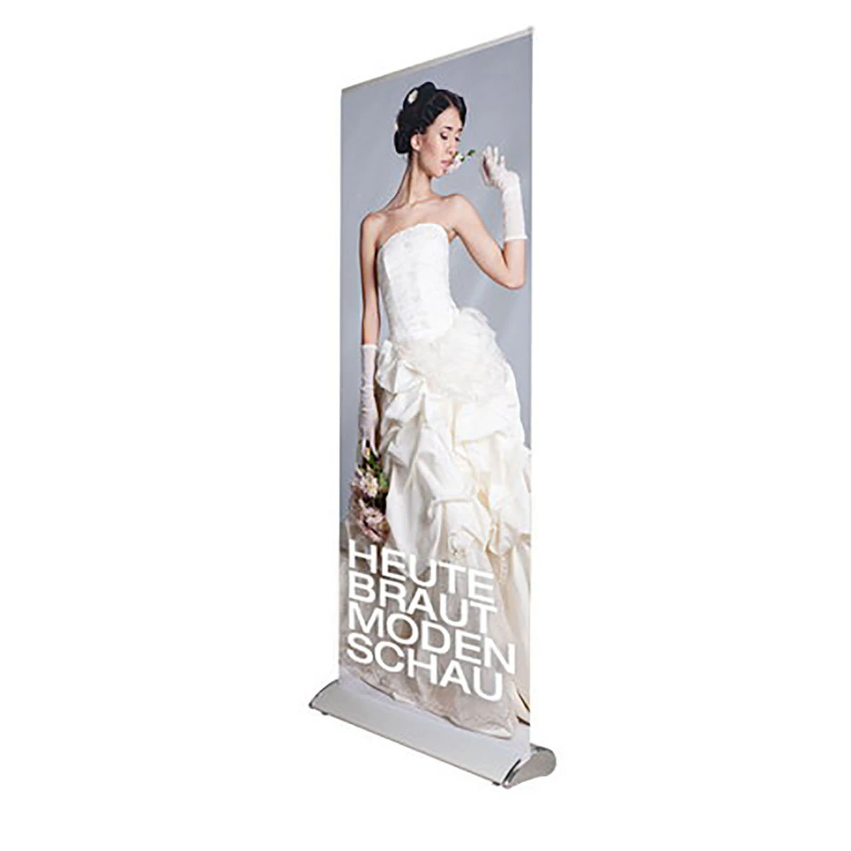 Einseitiger Roll-up mit variabler Höhe aus silbereloxiertem Aluminium hergestellt. Solide, kräftige Konstruktion in stilgerechtes Design. Klemmleiste oben sowie in der austauschbaren Rolle, ermöglicht eine leichte Montage des Banners. Inkl. kräftige schwarze Luxus Tasche.