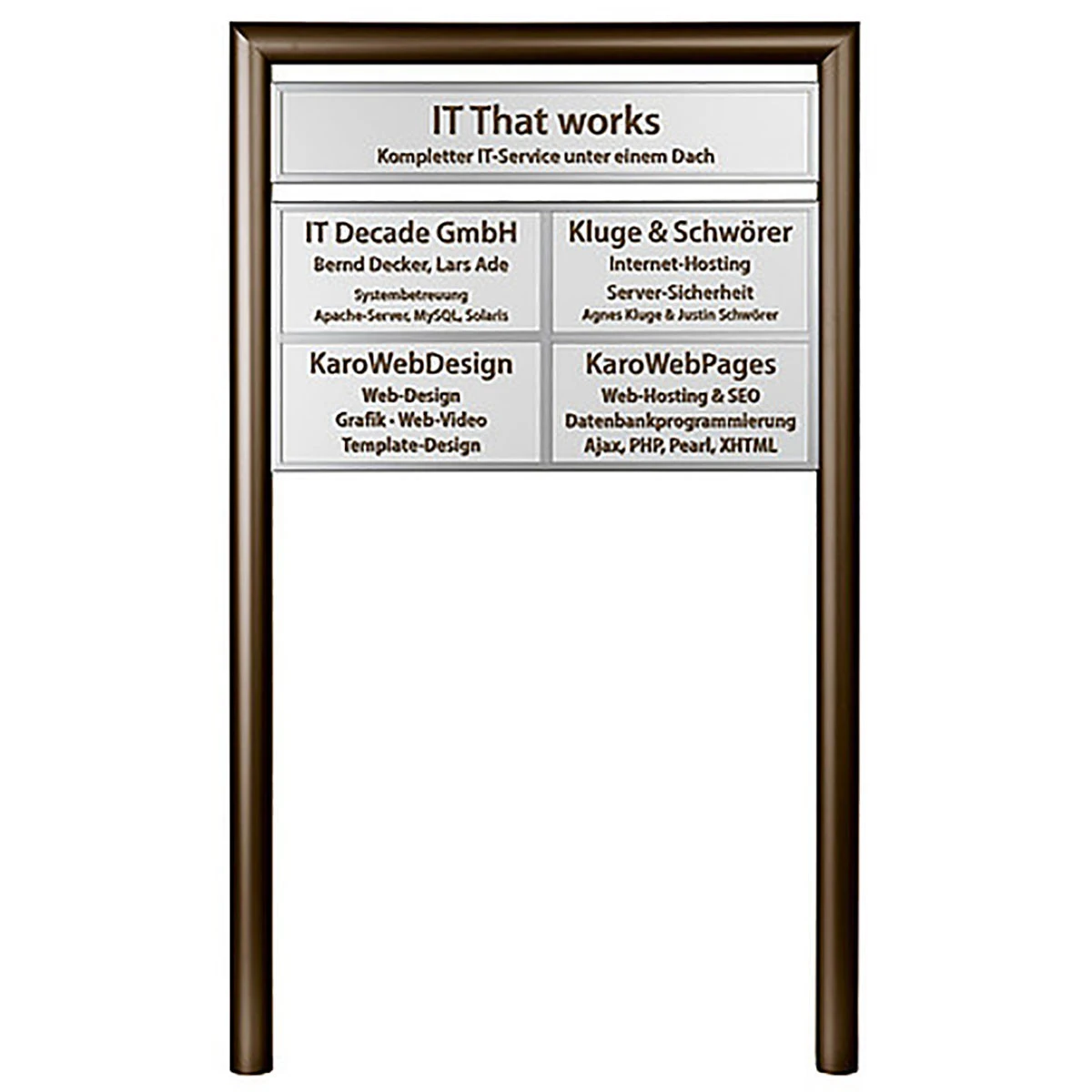 Rahmenprofil aus Aluminium nach Baukastenprinzip. Ermöglicht variables, schnelles und problemloses Wechseln der Beschriftungen durch waagerechte und senkrechte Trennleisten