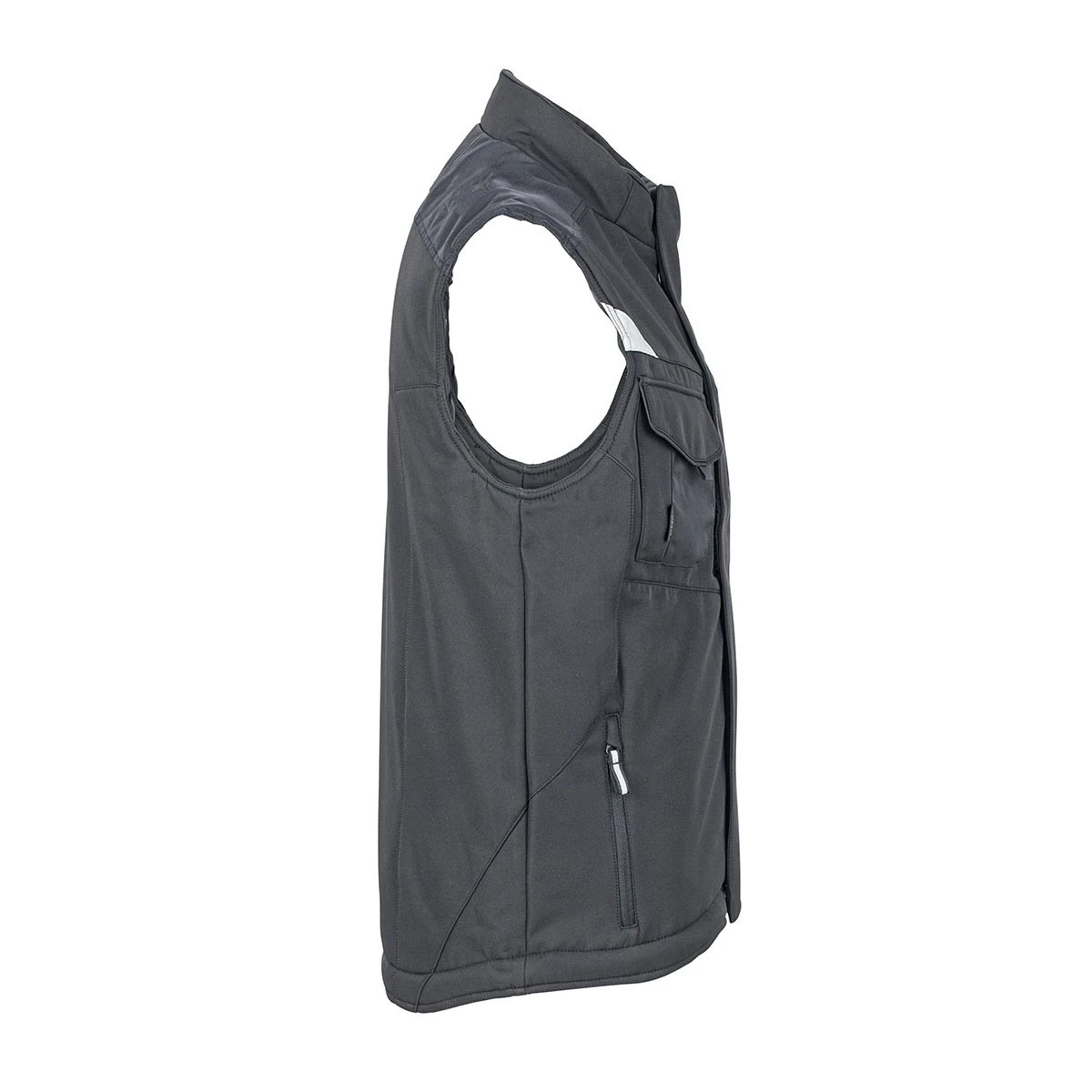 Die Softshellweste verfügt über zahlreiche praktische Taschen: Zwei Seitentaschen, eine Brusttasche mit Klappe, eine Innentasche mit Reißverschluss sowie eine spezielle Handytasche innen, die sicheren Stauraum bietet.