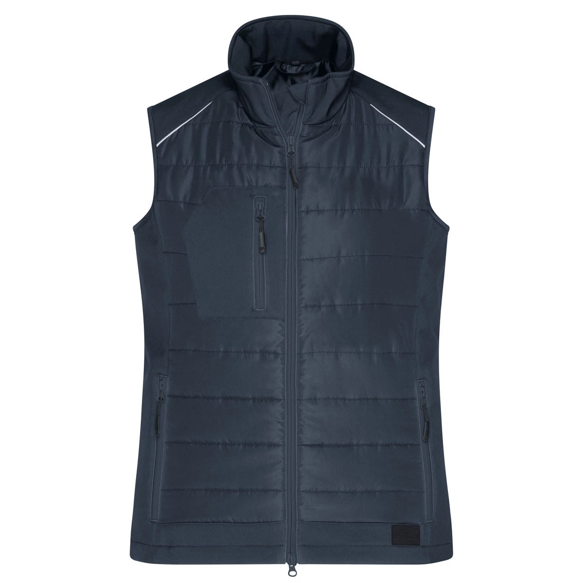 Die Ladies’ Hybrid Vest JN1821 verbindet pflegeleichtes 2-Lagen Softshellmaterial mit gesteppten Einsätzen im Vorder- und Rückenteil und bietet so einen perfekten Mix aus Funktionalität und femininem Design.