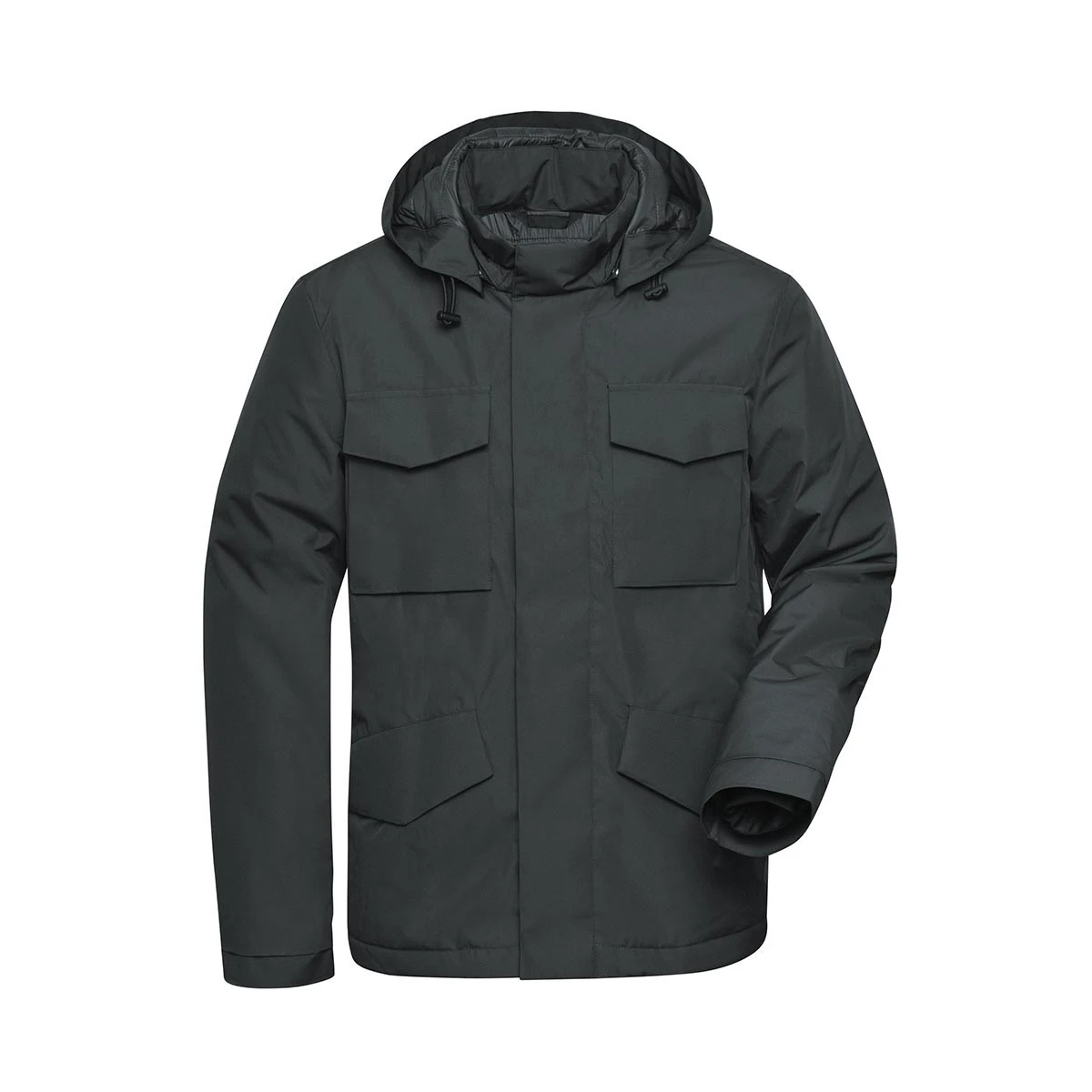 Praktische Details wie zwei Fronttaschen, zwei aufgesetzte Brusttaschen sowie eine Innentasche mit Reißverschluss bieten viel Stauraum. Elastische, innenliegende Armbündchen sorgen für Komfort und Bewegungsfreiheit.