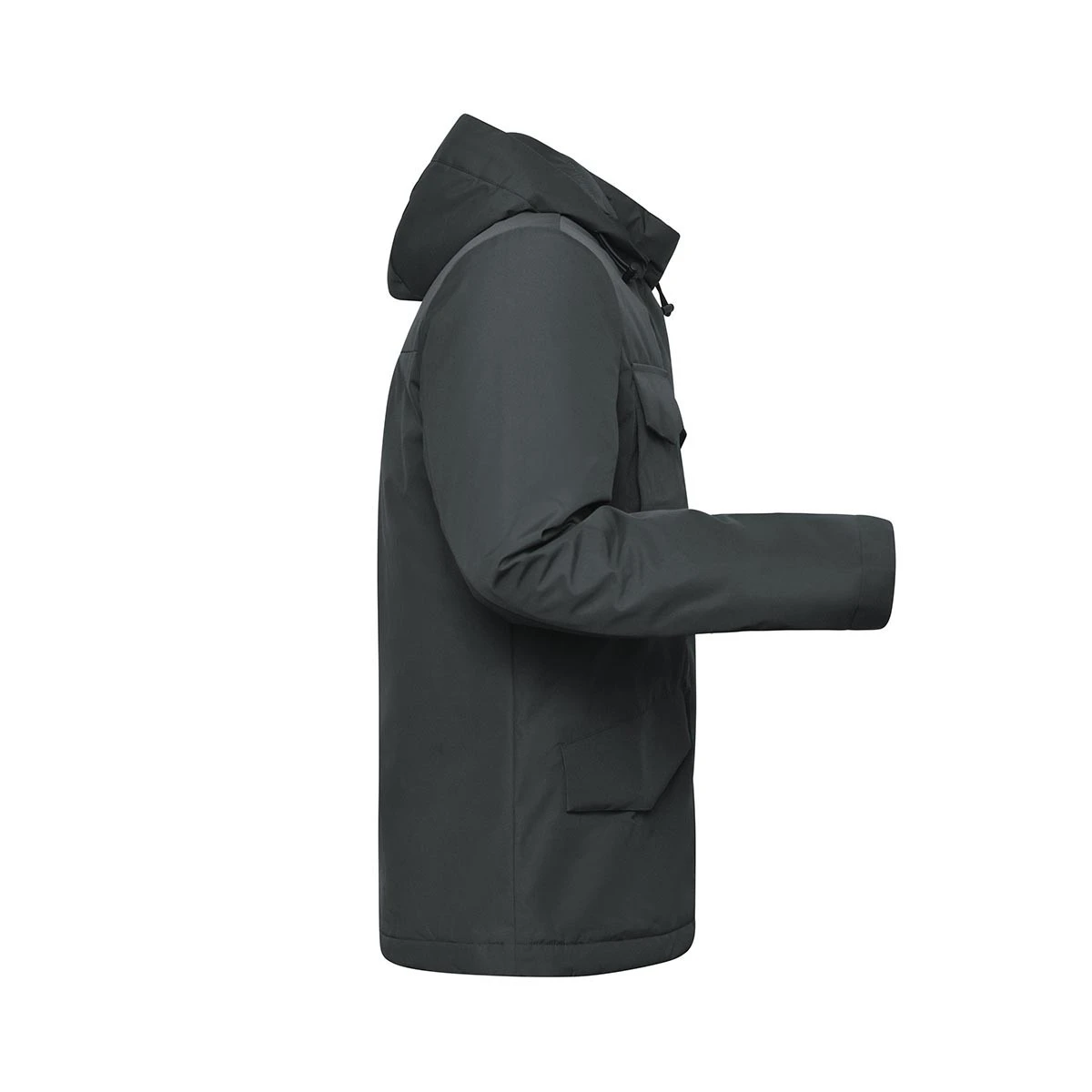 Das wind- und wasserdichte Material (5.000 mm Wassersäule) sorgt für zuverlässigen Schutz, während die Atmungsaktivität (1.500 g/m² in 24h) für ein angenehmes Tragegefühl sorgt. Der Stehkragen und die abnehmbare Kapuze bieten vielseitige Tragemöglichkeiten.
