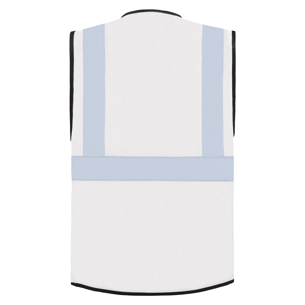Vier 5 cm breite Reflexstreifen – zwei horizontal und zwei vertikal – erhöhen die Sichtbarkeit deutlich. Die Ausstattung umfasst eine Ausweistasche, Handytasche und einen praktischen D-Ring für Schlüssel oder ID-Karten. Ein durchgehender Reißverschluss vorne sorgt für sicheren Sitz und einfaches Handling.