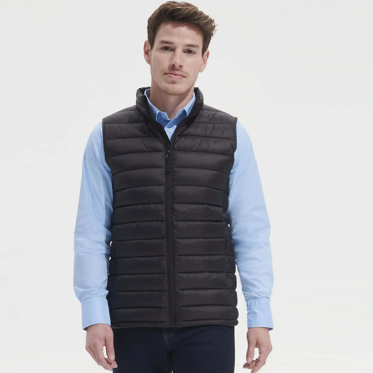 Der Bodywarmer hat einen niedrigen Stehkragen, der den Hals vor kaltem Wind schützt, und zwei seitliche Taschen, die farblich passend zum Futter gestaltet sind – ideal für kleine Utensilien. Praktisch: Er lässt sich im mitgelieferten Beutel kompakt verstauen, perfekt für unterwegs oder als Ergänzung zur Team- und Mitarbeiterbekleidung.
