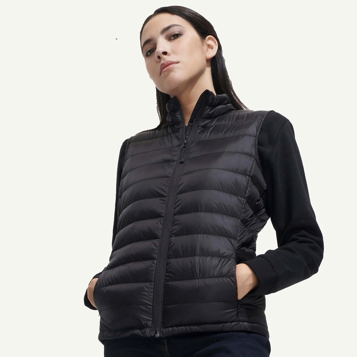 Der SOL'S Wilson Bodywarmer für Damen vereint Leichtigkeit mit erstklassiger Wärmeleistung. Gefertigt aus strapazierfähigem 100 % Nylon 380T und ausgestattet mit einer hochwertigen Wattierung aus 90 % Daunen und 10 % Federn (laufende Umstellung auf nachhaltige Füllung aus 60 % Sorona®-Polyester und 40 % recyceltem Polyester), hält dich dieser Bodywarmer auch bei kalten Temperaturen zuverlässig warm. Die Innenseite besteht aus 100 % Polyamid und sorgt für ein angenehmes Tragegefühl.