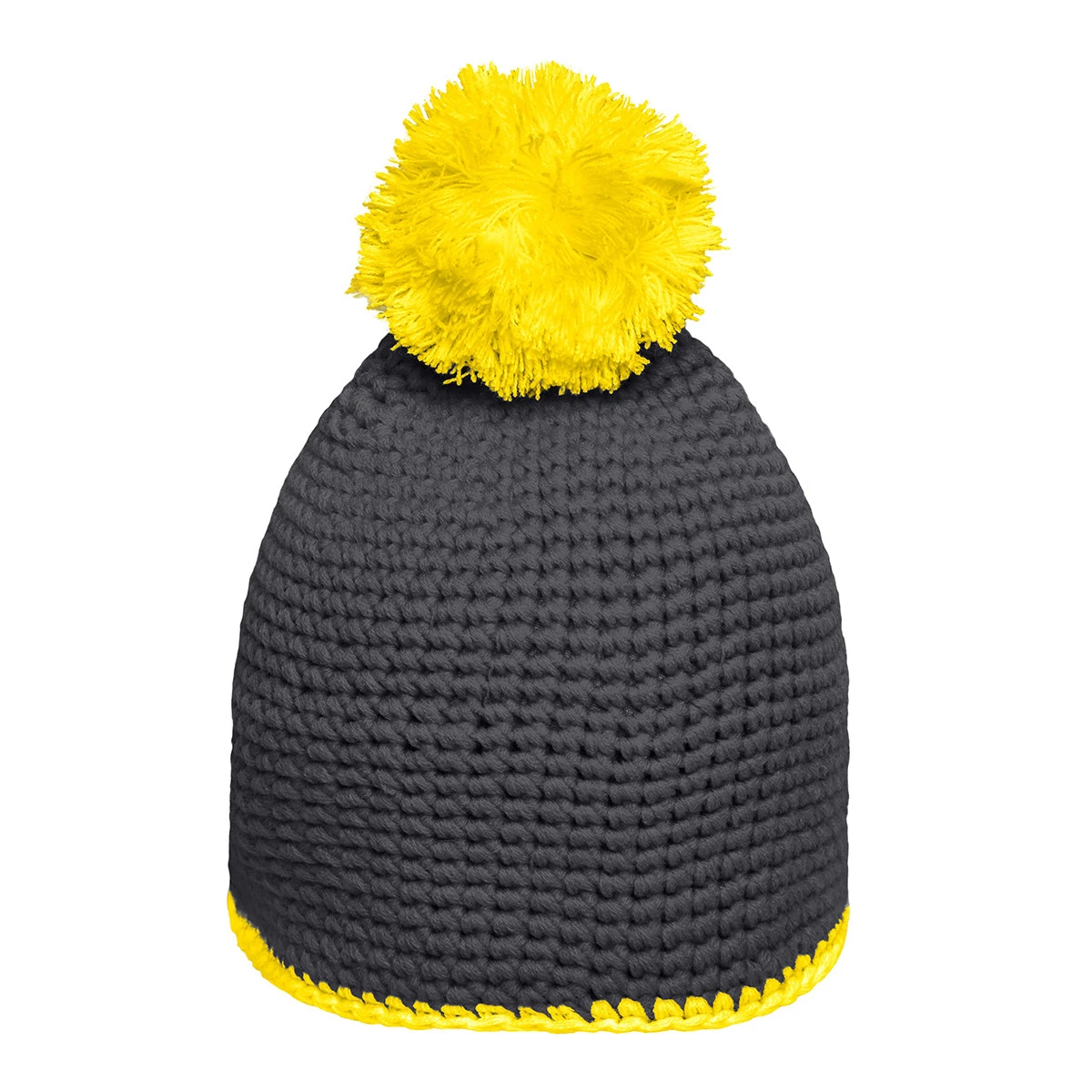 Besonderes Highlight sind der farblich abgesetzte Pompon sowie der kontrastfarbene Abschlussrand, die der Häkelmütze einen sportlich-verspielten Look verleihen. Die strukturierte Oberfläche bietet eine attraktive Grundlage für individuelle Branding-Elemente, sei es als Stick oder Label auf dem Saum.