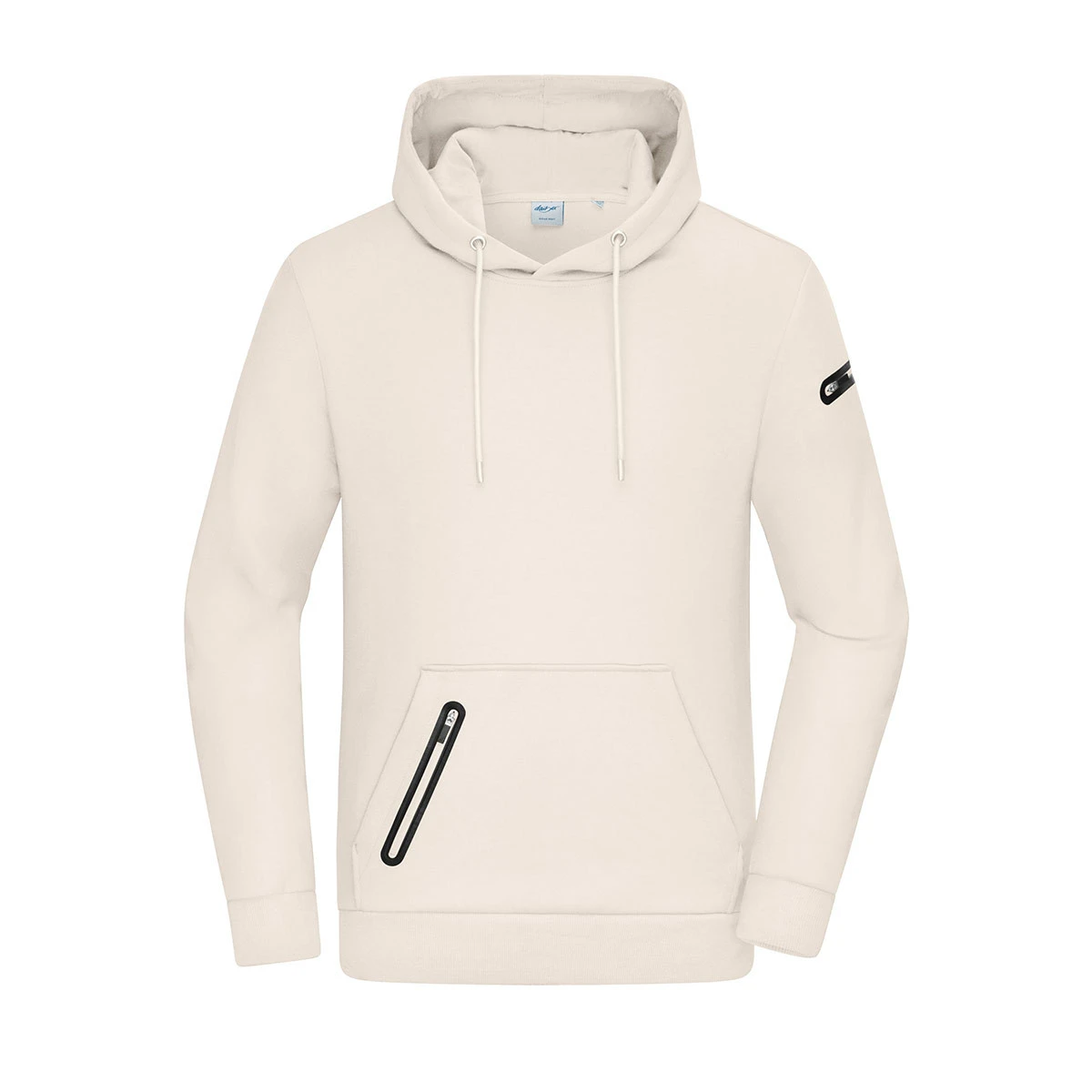 Elastische Armbündchen und der Saum mit Elasthan sorgen für einen bequemen Sitz und einen sportlich-cleanen Look. Die klassische Kängurutasche wird durch eine integrierte Reißverschlusstasche ergänzt und bietet sicheren Stauraum für Smartphone oder Schlüssel. Zusätzlich verfügt der Hoody über eine Reißverschlusstasche auf dem linken Ärmel: praktisch und zugleich ein modernes, funktionales Detail. Alle Reißverschlusstaschen sind mit modischem Tape umrandet, was dem Sweater eine hochwertige, technische Optik verleiht.