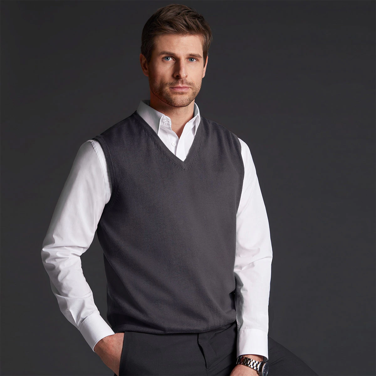 Dieser Pullunder ist vielseitig kombinierbar mit Hemden oder Shirts und bietet eine moderne Alternative zu klassischen Strickwaren.