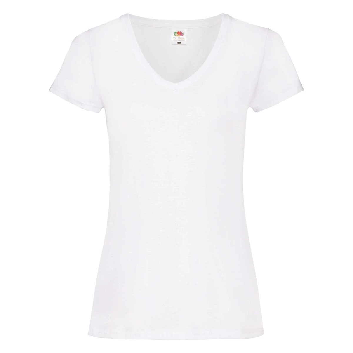 Das Ladies Valueweight V-Neck T-Shirt von Fruit of the Loom (Modell 61-398-0) ist ein hochwertiges Damen T-Shirt, das mit einem eleganten V-Ausschnitt überzeugt. Hergestellt aus 100 % Baumwolle mit einem Stoffgewicht von 165 g/m², bietet es eine perfekte Balance zwischen Leichtigkeit und Strapazierfähigkeit. Die Seitennähte sorgen für eine feminine, taillierte Passform, die optimalen Komfort und eine schöne Silhouette garantiert.