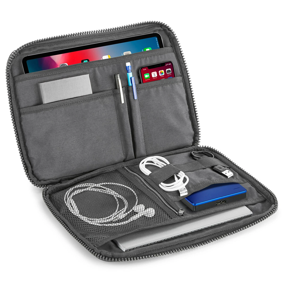 Der BagBase Essential Tech Organiser (BG65) ist aus robustem 600D Polyester gefertigt und bietet ein gepolstertes Innenfach, das Tablets bis 11" sicher schützt. Mit einer praktischen Fronteinschubtasche, verschiedenen Innenfächern, einem elastischen Kabelordner und einer innenliegenden Netztasche mit Reißverschluss eignet sich der Organizer perfekt für Veranstaltungen, Firmen und Vereine. Das herausnehmbare Etikett ermöglicht individuelle Veredelungen.